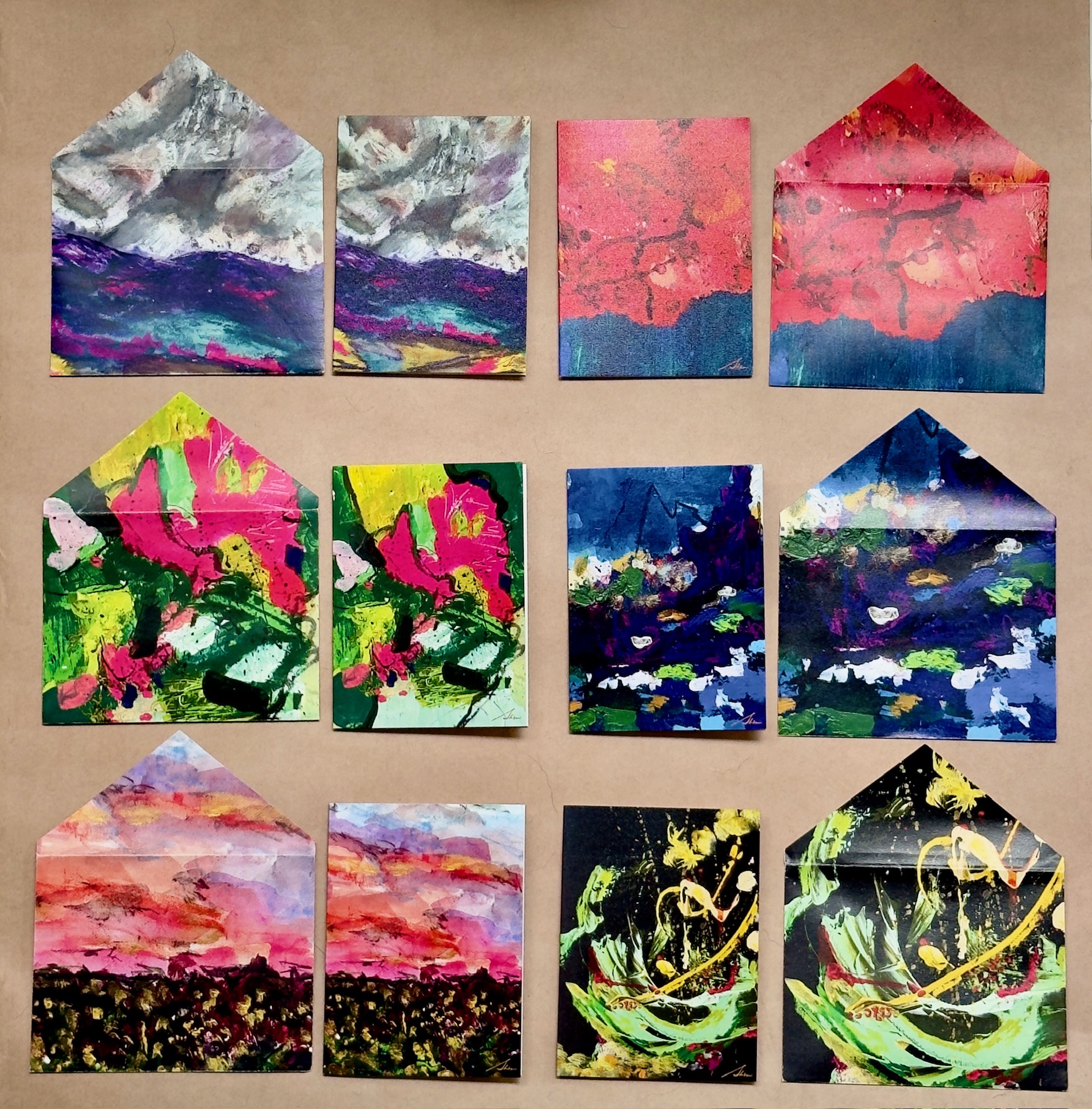 These mini notecards are adapted from Shibani’s abstract landscape paintings. Evocative, expressive, and full of movement. Each one captures a fragment of colour and emotion, printed on beautifully textured paper. The set includes six cards with six matching envelopes.
